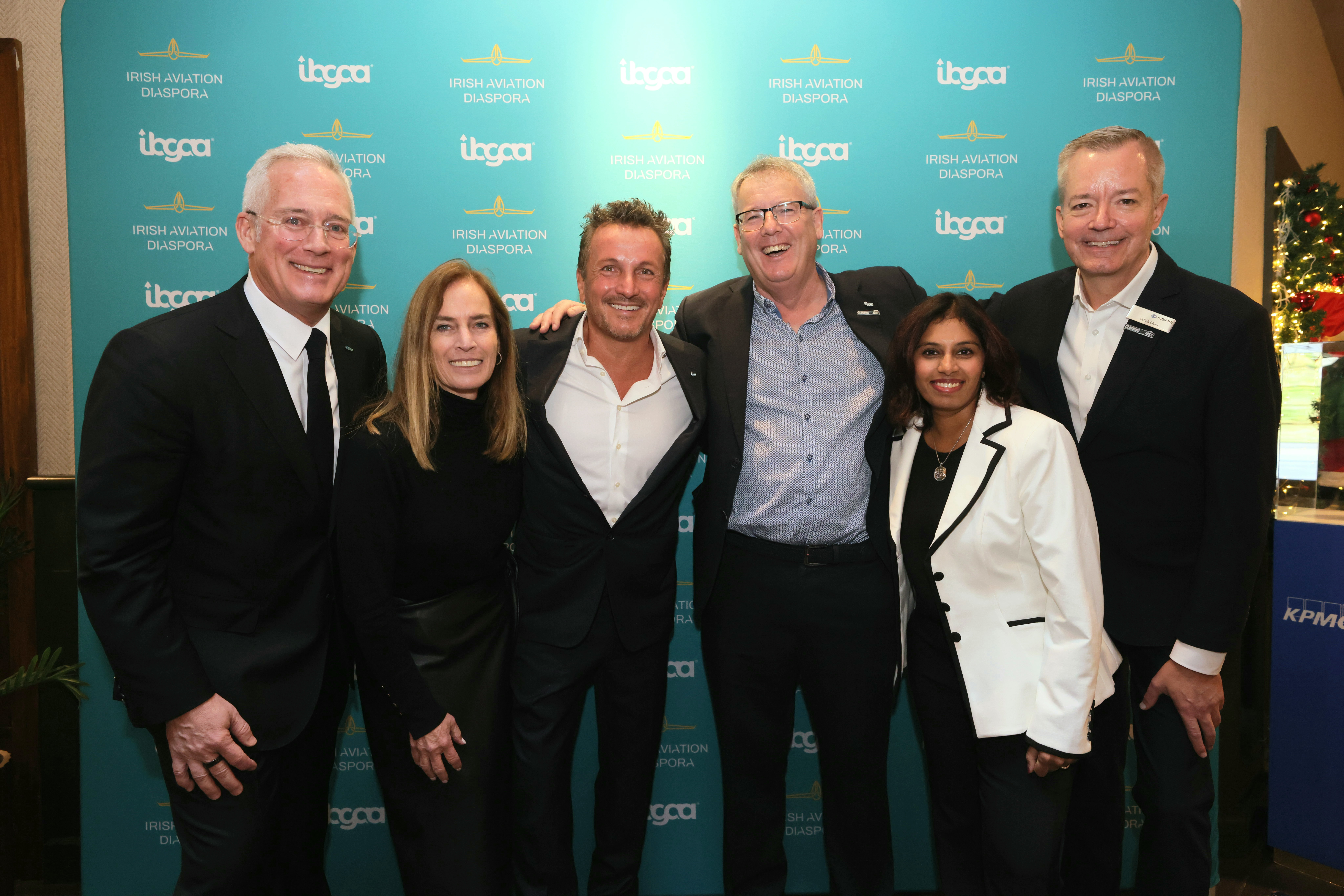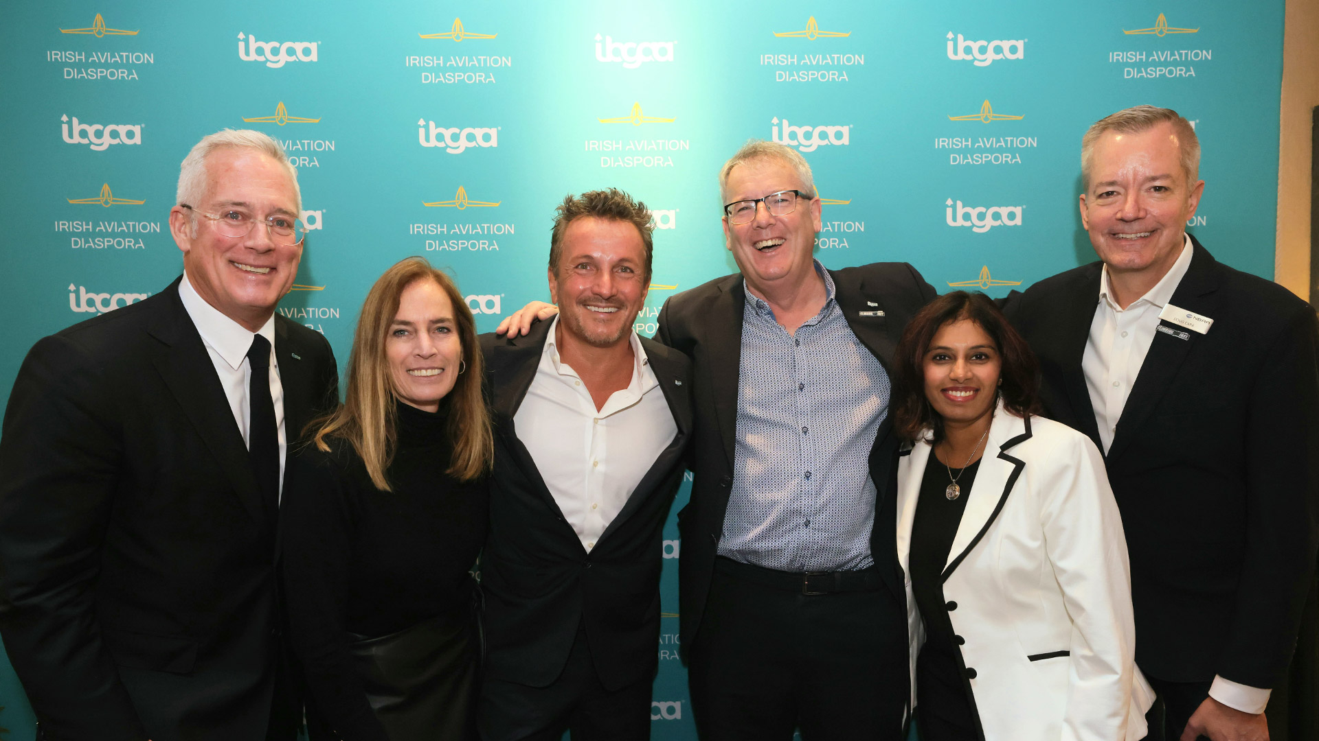 From left: International Business Aviation Council Director General Kurt Edwards joins 4AIR Chief Operating Officer and Cofounder Nancy Bsales, Irish Business and General Aviation Association (IBGAA) Founding Chairman Josh Stewart, IBGAA Founding Executive Director Joe Buckley, Gulfstream Aerospace Vice President and Chief Sustainability Officer Smitha Hariharan and NBAA Senior Vice President, Sustainability & International Affairs Doug Carr, to welcome IBGAA as a new partner in the industry’s CLIMBING. FAST. advocacy campaign.